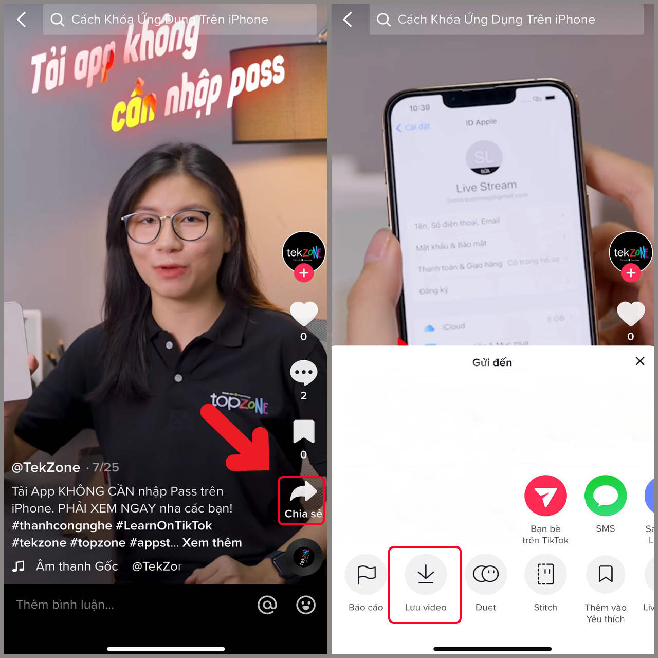 Bước 1: Trước tiên, bạn cần mở ứng dụng TikTok trên thiết bị của mình. Sau đó, hãy tìm kiếm và chọn video mà bạn muốn sử dụng làm nhạc chuông. Tiếp theo, bạn hãy nhấn vào nút chia sẻ, sau đó chọn tùy chọn Lưu video. Lúc này, bạn chỉ cần chờ một chút để video từ TikTok được lưu về điện thoại của bạn.